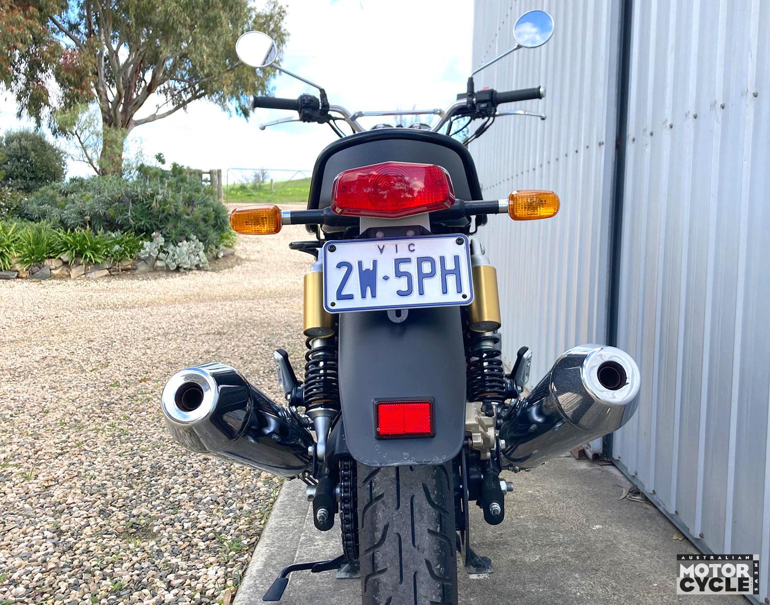 Those huge megaphone-style mufflers dominate the rear. However, the exhaust adds to kerb weight. Replace with an S&S or Tassie Vertex 2-1 for less than $2k and you could save 15kg