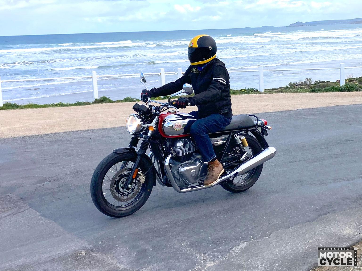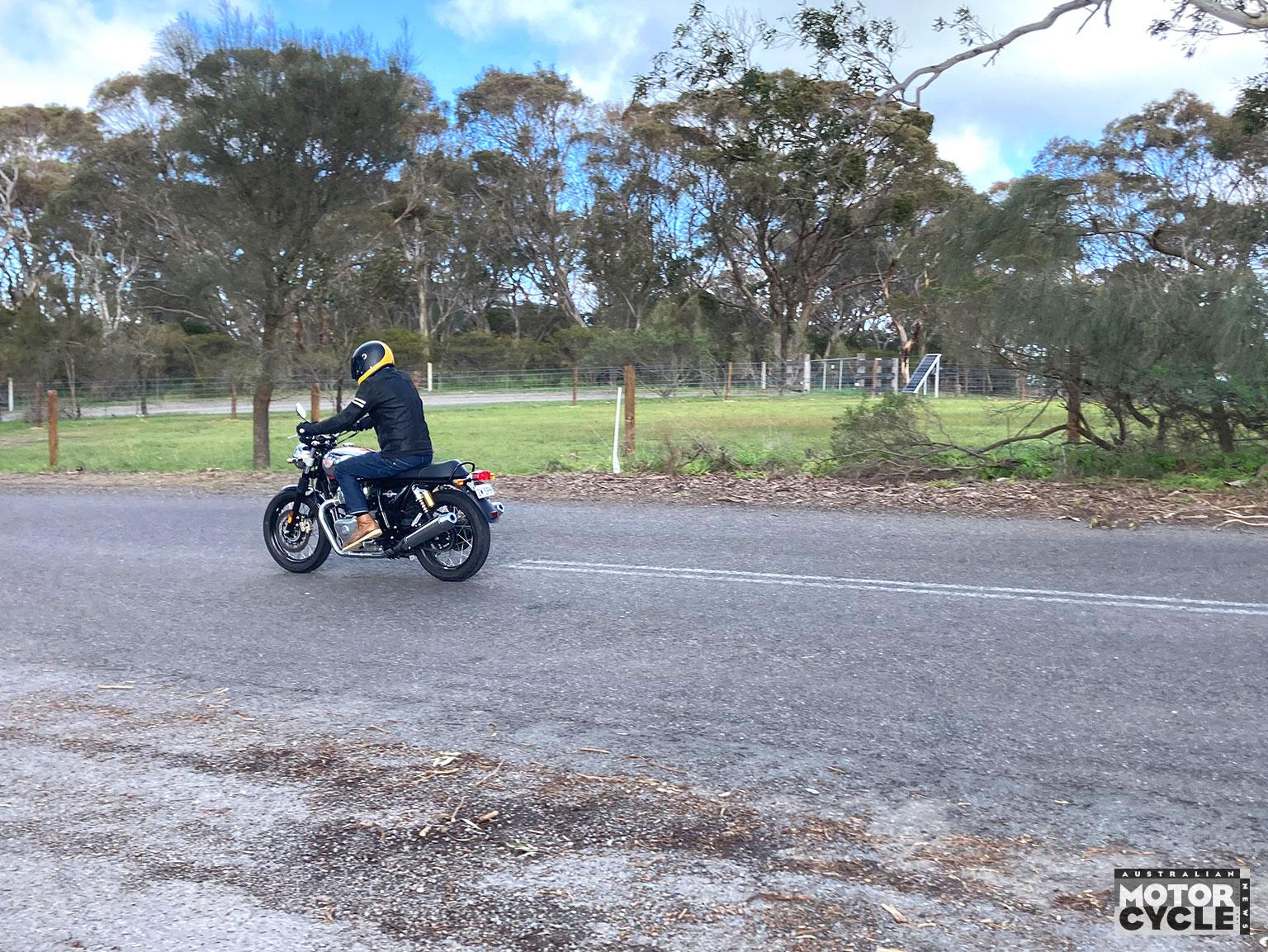 Turning off onto a series of ridgetop roads that led to the coast provided an early chance to test the handling. Despite the wind sweeping the blacktop with gum leaves, the Interceptor 650 maintained a brisk pace.