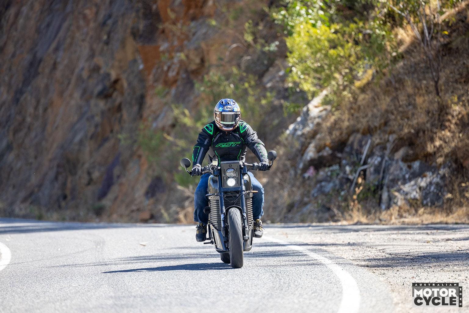 You can see how easy it was on the video at amcn.com.au/video/. A feet-up circle with no need to drag the rear brake like you might on a heavyweight cruiser. I think a lot of this has to do with the 1440mm wheelbase (which is similar to a Ducati Panigale V2). No doubt this was another factor in its ability to turn quickly and easily in the hairpins on Gorge Road.
