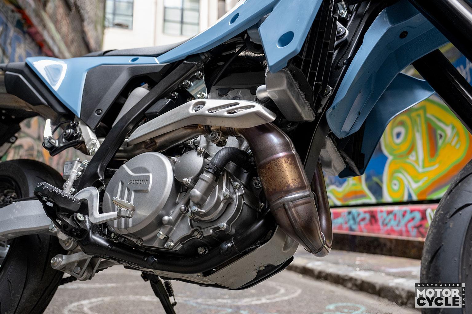 The single-cylinder, liquid-cooled, DOHC four-valve layout might sound familiar, but Suzuki has changed a huge number of components to meet current regs without gutting performance. Highlights include titanium intake valves and hollow sodium-filled exhaust valves (lighter and they allow more freedom in camshaft design), revised intake and exhaust cams, revised valve springs, a revised cylinder head, a new piston designed to reduce mechanical loss, and revised crankcases aimed at reducing pumping loss and oil mixing loss. There’s also a new airbox and inlet design aimed at reducing intake resistance while keeping response sharp.
