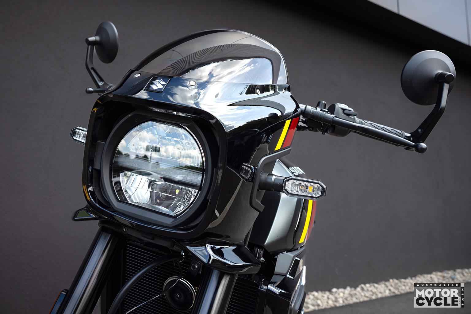There are some differences: a lighter (by 2.1kg) lithium-ion battery, and a distinctive flat-bottom headlight that is mounted closer to the ‘bars to promote lighter steering. Trendy bar end mirrors are a first for Suzuki, the sculpted fuel tank jumps up in capacity from the GSX-8S’s 14 litres to 16.5 litres, and both the T and TT have individual seats that are larger and softer, for both rider and pillion. In essence, though, we are riding a GSX-8S.