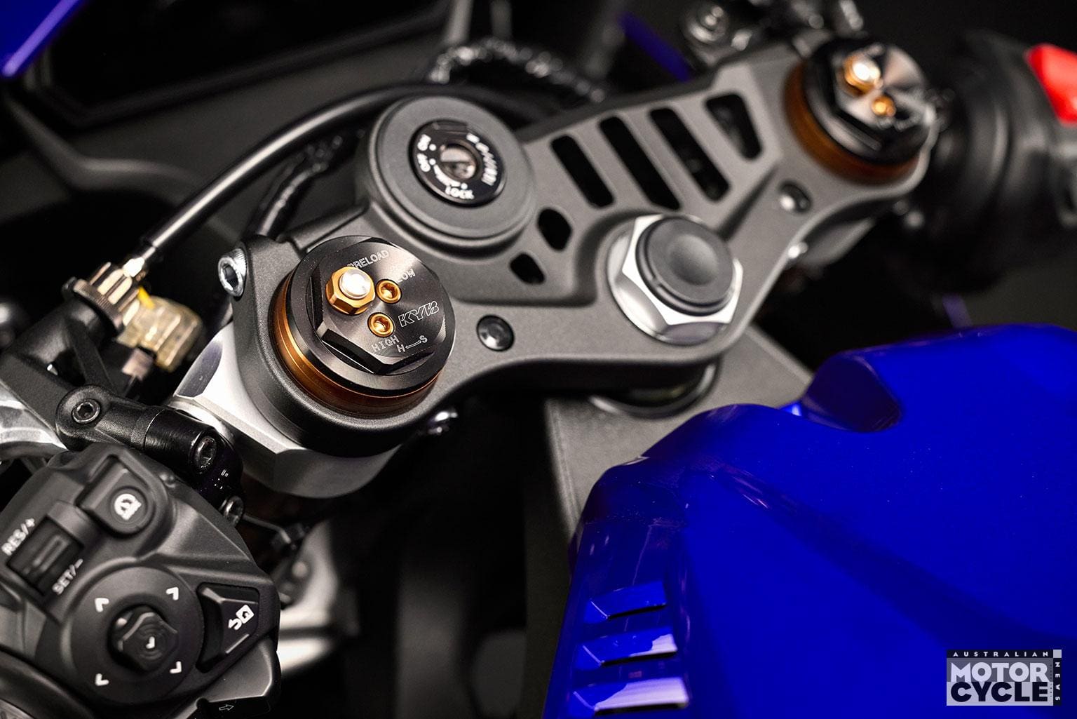 Keen eyes will see similarities between the MT-09 and XSR900 Deltabox chassis and the new R9. It does look familiar but there have been a few tweaks to make it more supersport capable and deliver a desired 50/50 weight distribution with the right amount of stiffness and flex. The frame is stiffer and lighter than the MT-09 at 9.7kg, but has more flex and is lighter than the outgoing R6. The suspension is high-spec KYB gear. The fork looks as if it’s straight off the base model R1, but I can’t confirm. It has high and low-speed compression, rebound and preload adjustment at the top of the fork. The rear shock also has high and low-speed compression and rebound adjustment. It also features a hydraulic preload adjuster for quick adjustments by hand. The fork is shorter overall than the XSR900, making its steering angle steeper for faster changes of direction while increasing tyre load at the front.