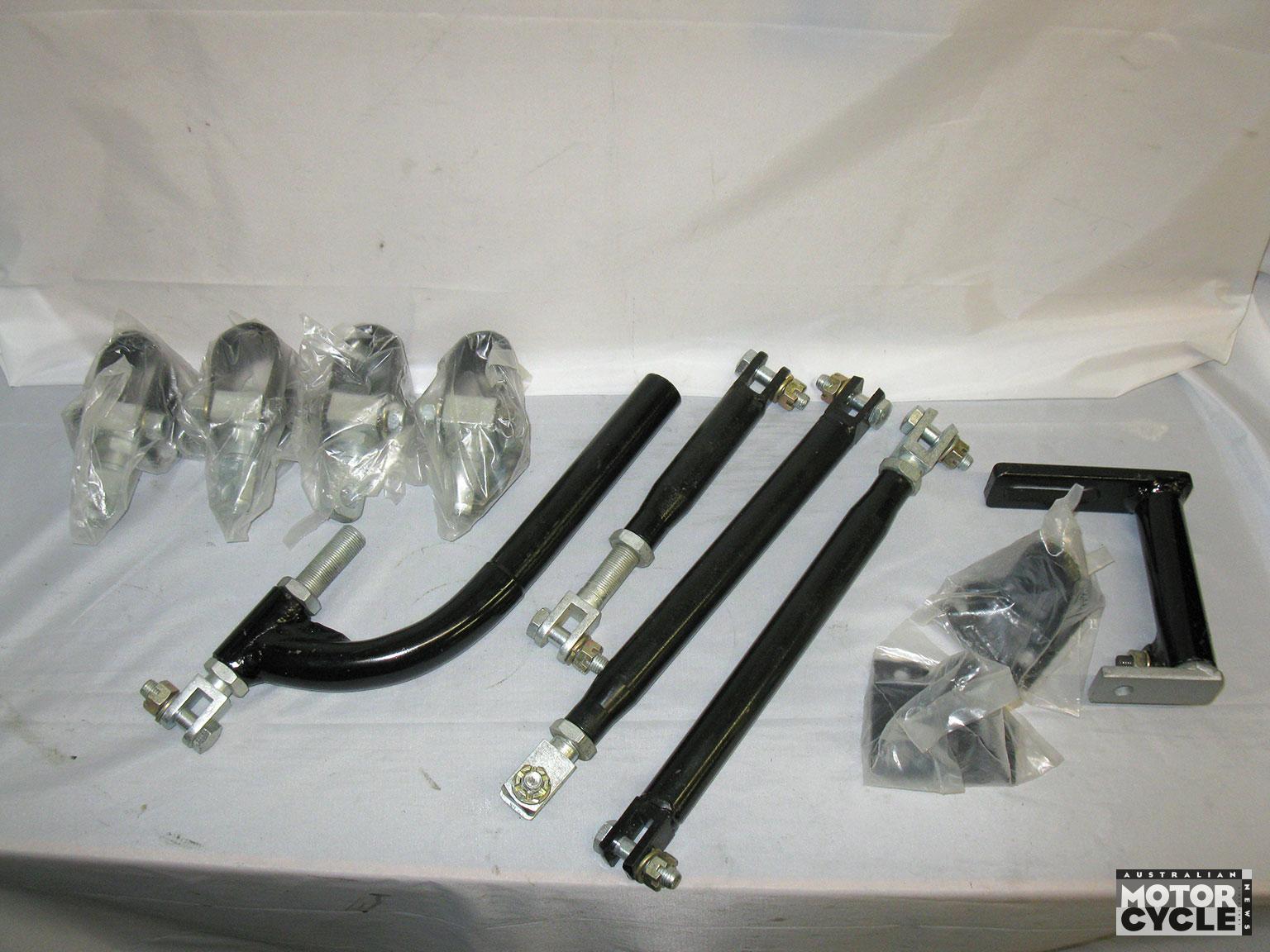 “We’ve fitted them to BMWs, Kawasakis, Harleys and plenty of Royal Enfields,” says Derek Rawlings, who has worked at EuroBrit for 21 years. “They go on really well with anything in that mid-weight category. They weigh just 85 kilos, so they go on a smaller bike really well, and it can be a very much do-it-yourself thing if you’ve got a bit of mechanical nous. We provide instructions on how to set up the toe-in and the lean-out and everything else, which is very crucial, but you don’t have to be an engineer.”