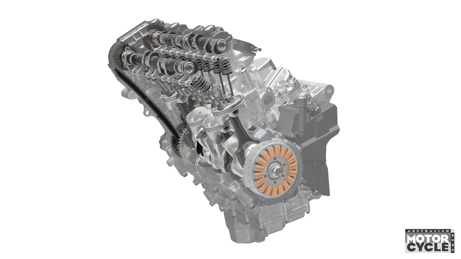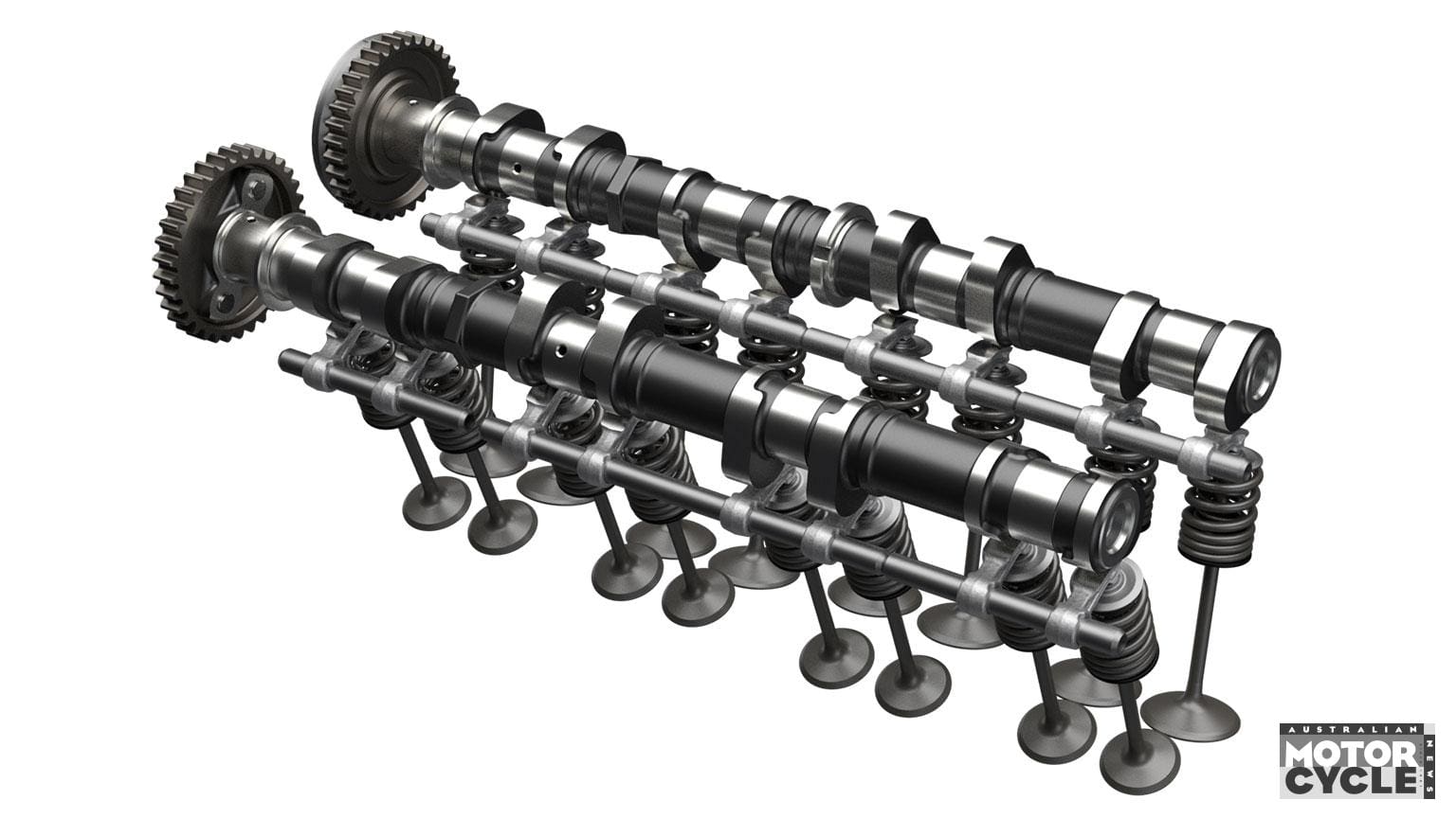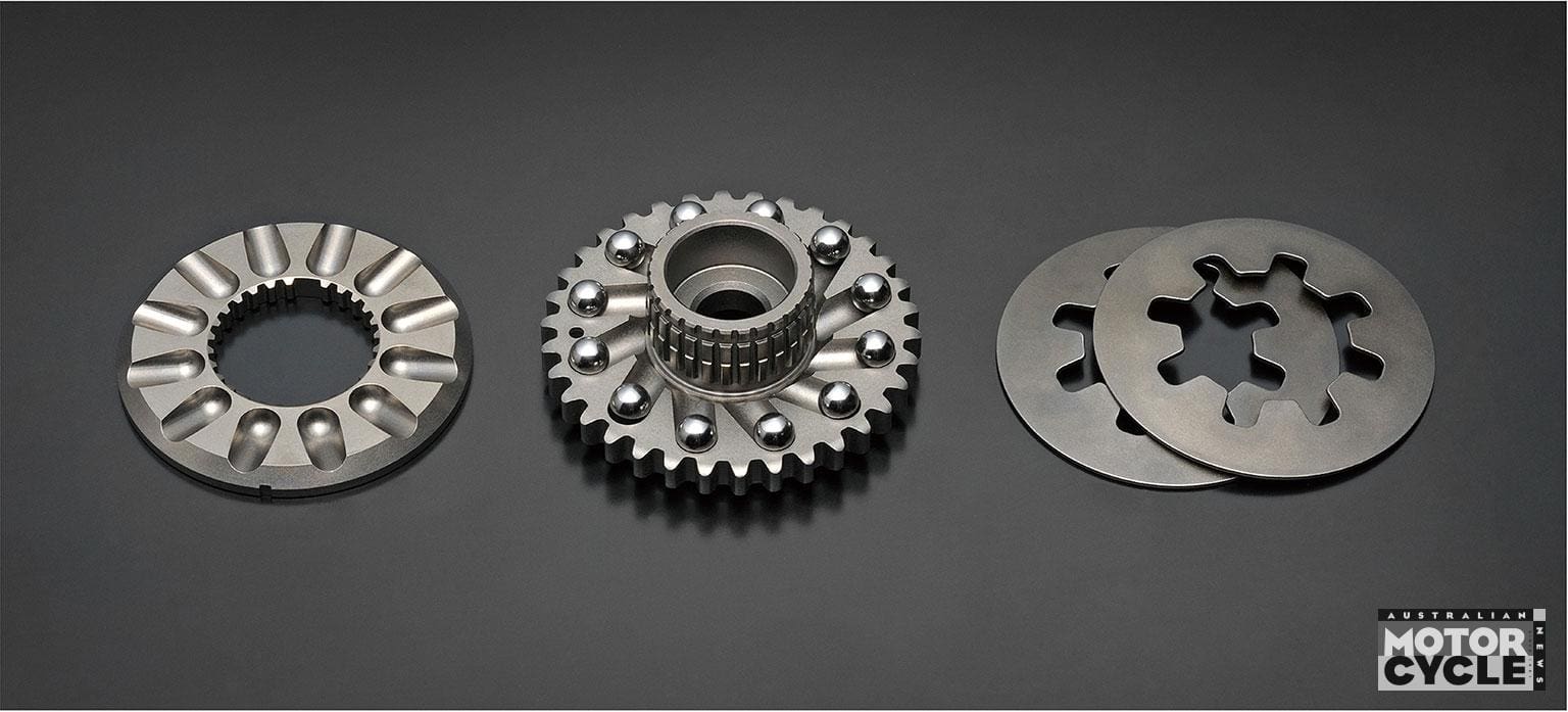 The core of the bike is unchanged, retaining the same 999.8cc inline four, complete with its innovative all-mechanical variable intake valve timing system, which was derived from a clever design created for Suzuki’s GSV-R MotoGP bike to skirt racing regulations that banned electronic or hydraulic variable valve timing. The system is entirely automatic and uses centrifugal force to alter the valve timing, with steel balls mounted in curved, radial slots carved in the intake cam sprocket where it engages with a matching plate on the nose of the camshaft – a slightly different curve for those channels on each of the two parts means that as the balls are thrown outward by centrifugal force, the intake camshaft rotates by a few degrees in relation to its sprocket, retarding the timing at higher revs for more valve overlap and increased peak power.