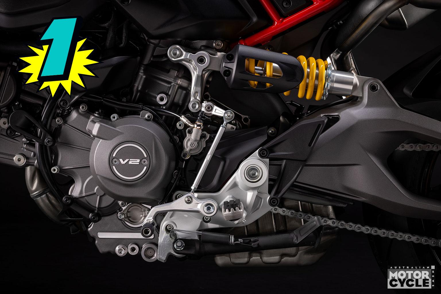 Ducati went and replaced its 937cc Testastretta V2 DVT engine with a new 890cc V2 with variable valve timing. Unlike the Testastretta engine it replaces, it employs conventional chain-driven camshafts  and spring return valves operated by finger followers. Ducati lists valve-clearance checks at 45,000km, the longest interval yet, which in itself is significant as it replaces the Desmodromic valve system used by Ducati for the last 50 years.