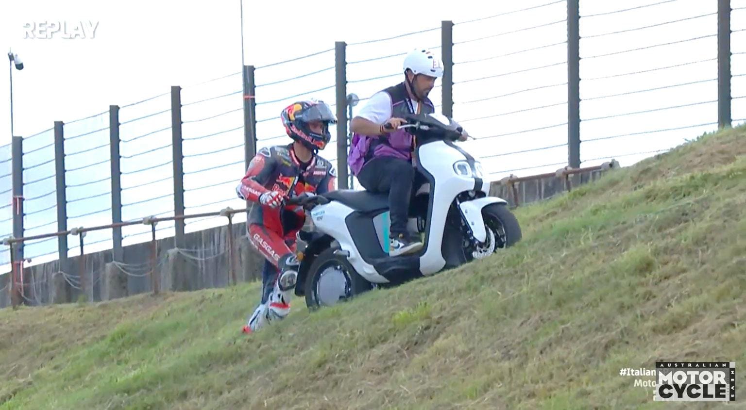 Pedro Acosta was ruing Dorna’s zero-emission paddock vehicle mandate during the all-important Friday afternoon practice session at Mugello when he was forced to hitch a ride on the back of a photographer’s scooter after a tumble. His urgency to get back to the garage was hardly reflected in the rider’s vain attempts to power his now two-up electric scooter up a steep slip road – Pedro started paddling first, but it was when the photographer also began paddling with both feet and when the scoot all but came to a stop that Pedro was forced off the back and instead found himself pushing the photographer and his electric scooter up the hill.