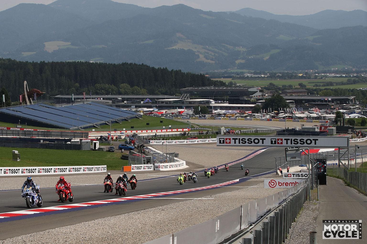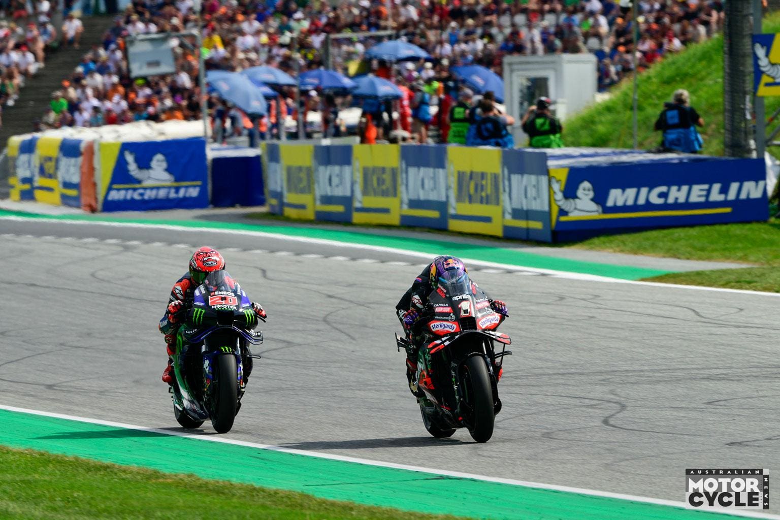 The Austrian Sprint race burst into life under bright sunshine, though dark clouds brooding in the background threatened to douse the circuit at any moment. Alex Marquez fired off the line for the holeshot while Marc also got a great start to slot straight into second, the brothers edging past Marco Bezzecchi. Francesco Bagnaia had a nightmare opening lap, spinning his rear tyre off the line and tumbling all the way to 14th as the field streamed past.
