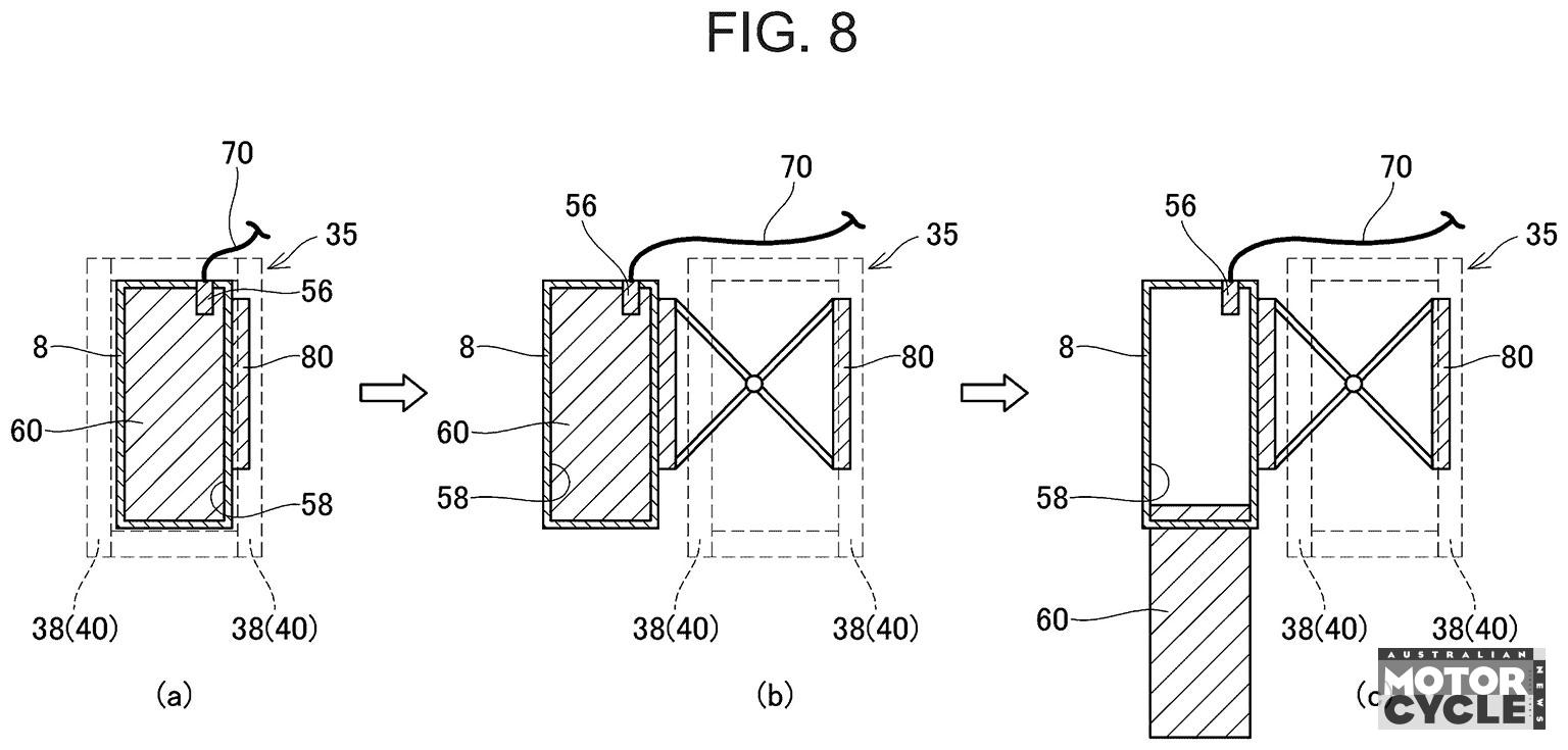 The patent addresses the fact that the hydrogen tank on a fuel cell scooter, like the various prototype Burgmans that Suzuki has built since the mid-2000s, sits low down in the bike’s spine. That’s good for the centre of gravity and mass centralisation, but makes access tough if you’re trying to swap the cannister. It’s a problem that makers of battery-swappable electric bikes have also faced: if the batteries are buried in the centre of the bike, it’s hard to access and swap them.