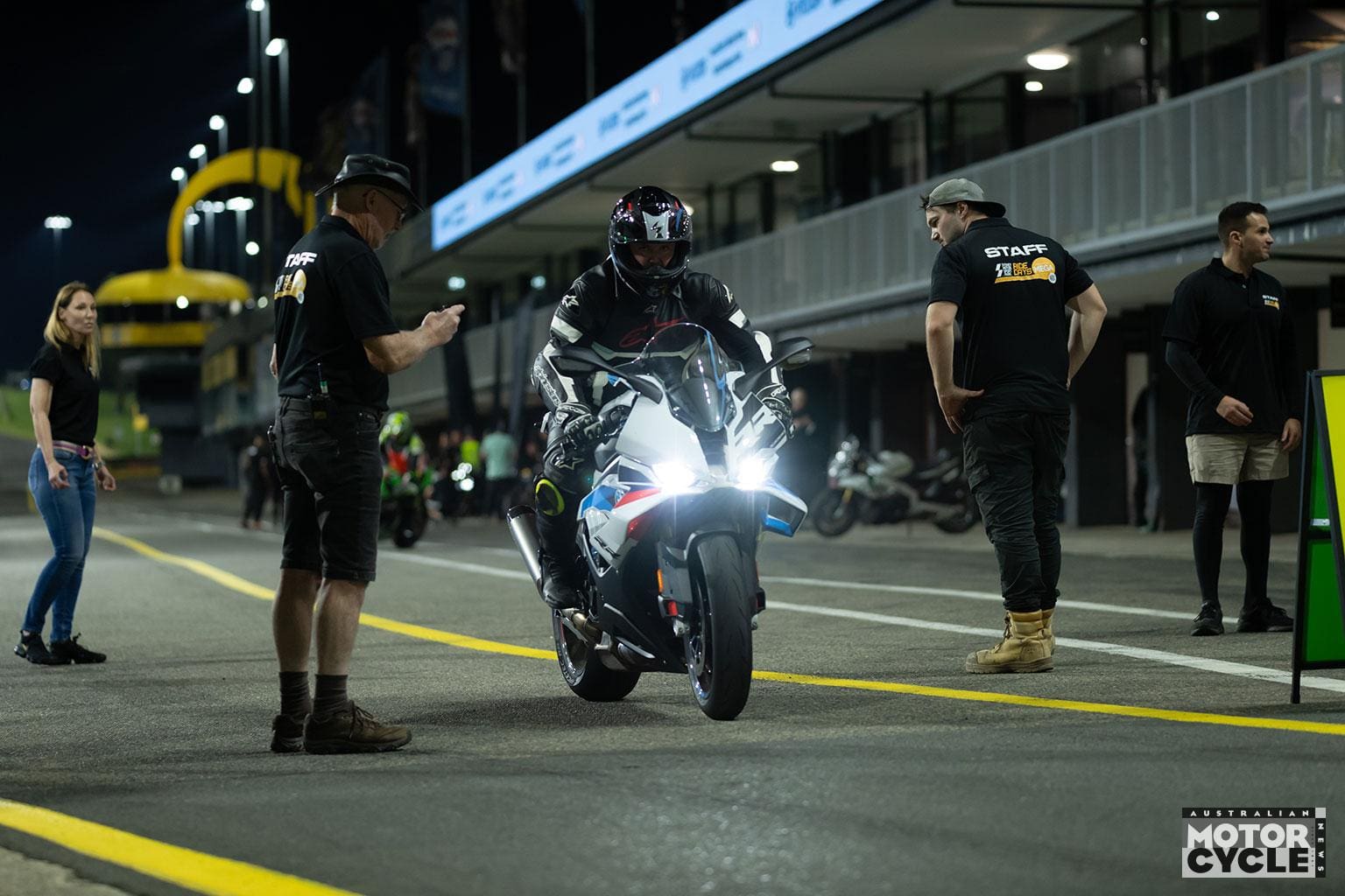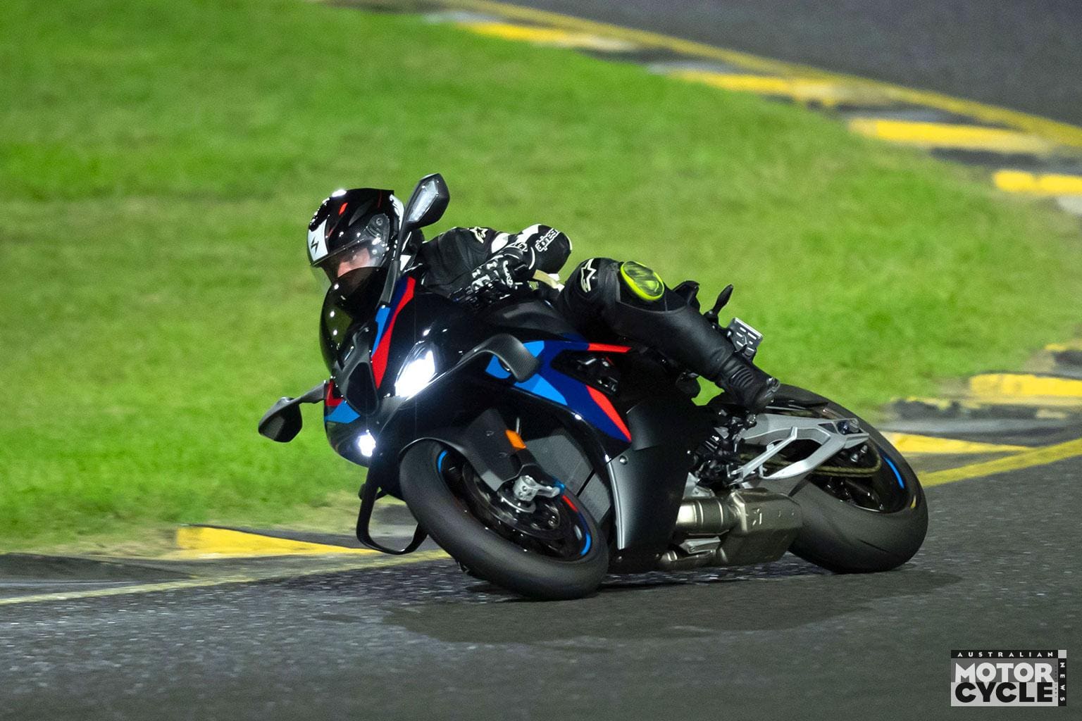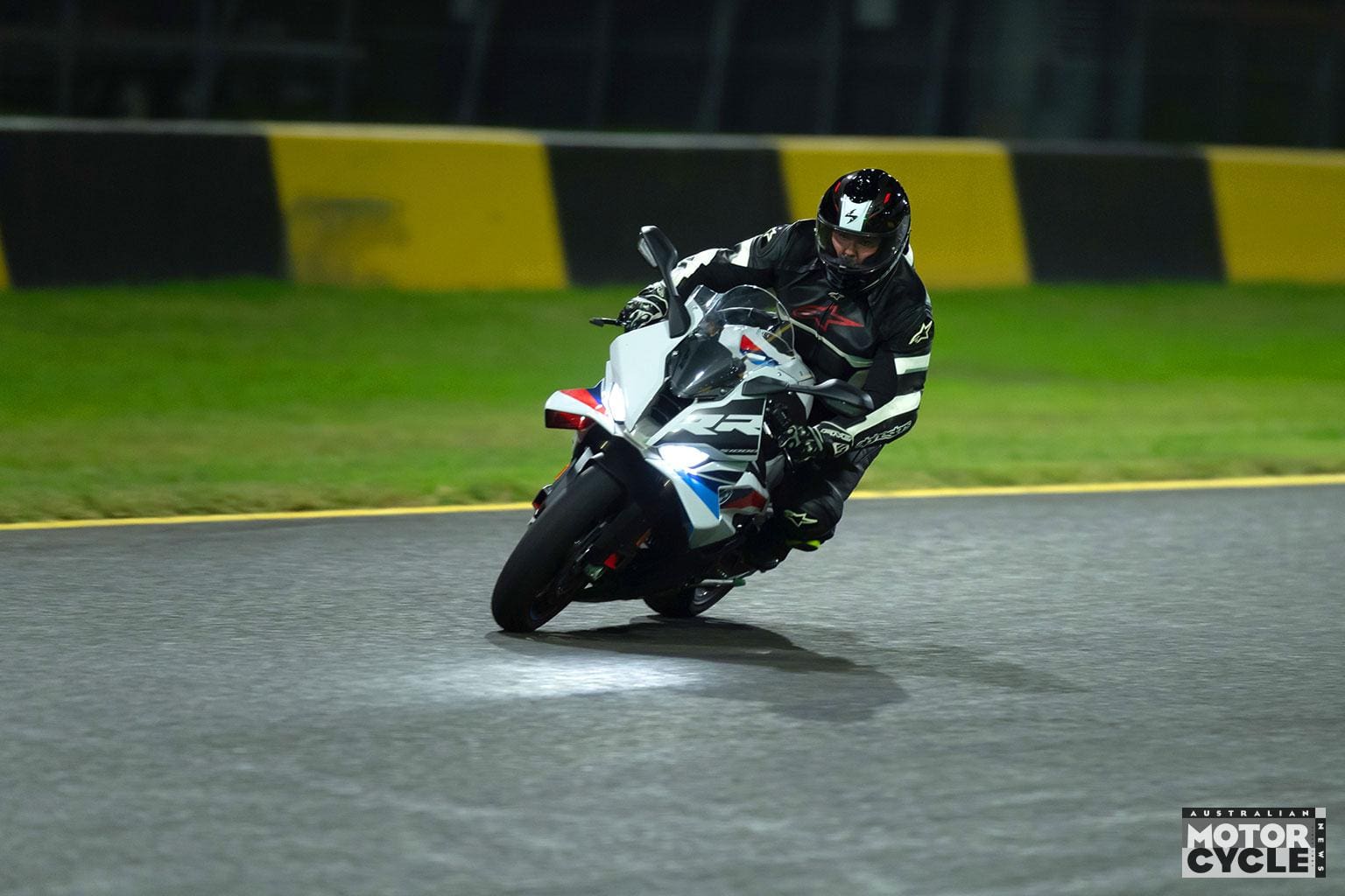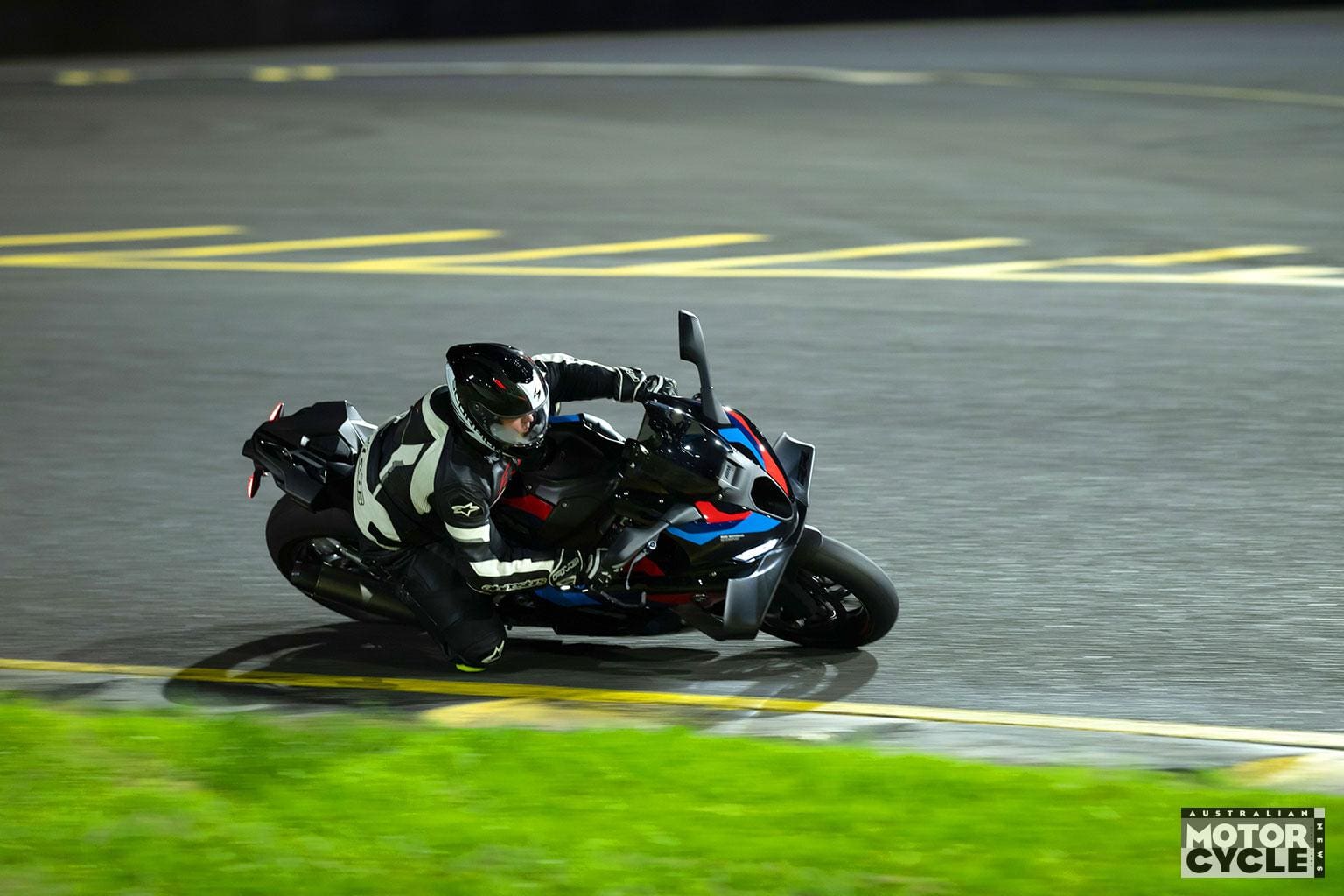 It was my first time doing laps at Sydney Motorsport Park at night, so for the first session I grabbed the only bike with scrubbed-in tyres, dialled up Dynamic mode and headed out into the fast group. It just so happened to be the blinged-out M-Sport model, complete with carbon wheels.