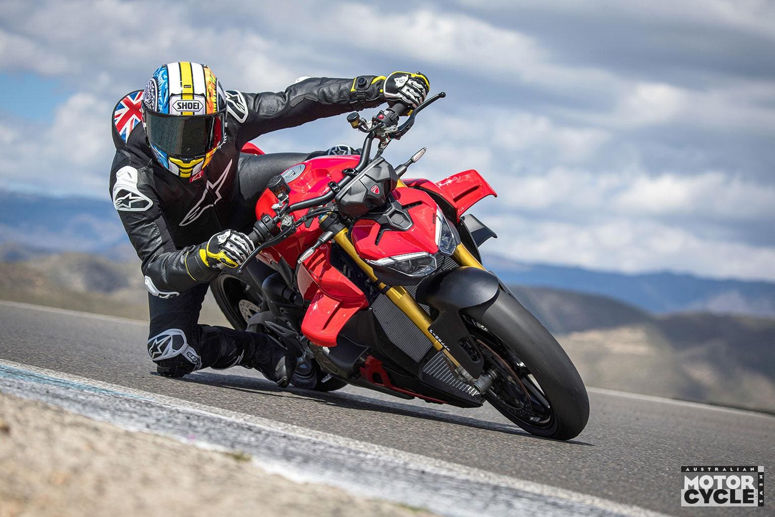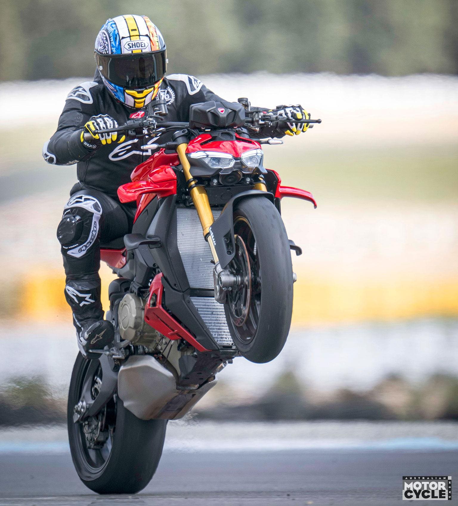 Stability was also excellent. Ducati claims the twin biplane wings deliver another 17kg of downforce more than the 2024 model (making 45kg total) at 270km/h, which we were just about hitting on the back straight. Getting a powerful naked bike to remain stable at speed is hard work as the rider is pulling on the ‘bars – hanging on for dear life, basically – and in turn pulling the fork legs out of their stanchions, shifting weight to the rear.
