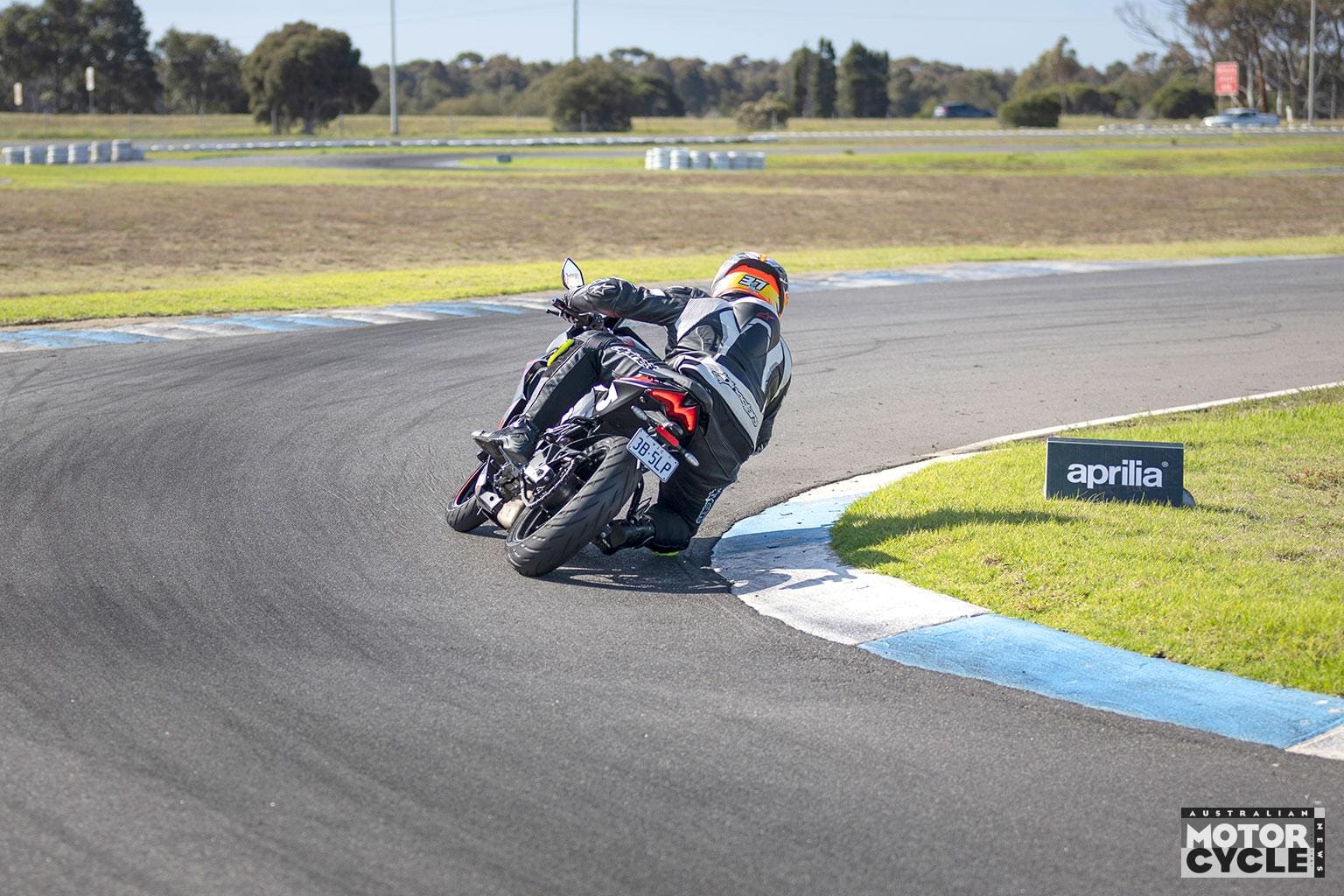 Pushing on, I was quite impressed with the power delivery; I could ride the whole track in third gear and there was heaps of torque still available. Aprilia tells me that 82 percent of the maximum torque is available at just 3000rpm and I believe it. It’s quite surprising how well it pulls from down low for a small engine.
