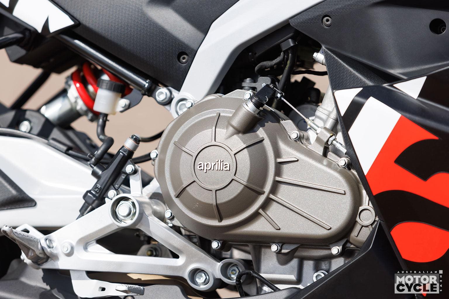 Powered by a 457cc forward-facing parallel twin – essentially the front half of an RSV4 Superbike engine – the double-overhead-camshaft head houses four valves per cylinder. It produces 35kW (47hp) of power and 43.5Nm of torque. As it only weighs 175kg wet, this gives the RS 457 the highest power-to-weight score of the category (just) and even the RS 660 in LAMS spec.