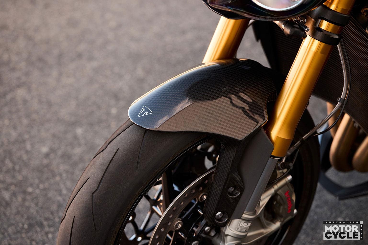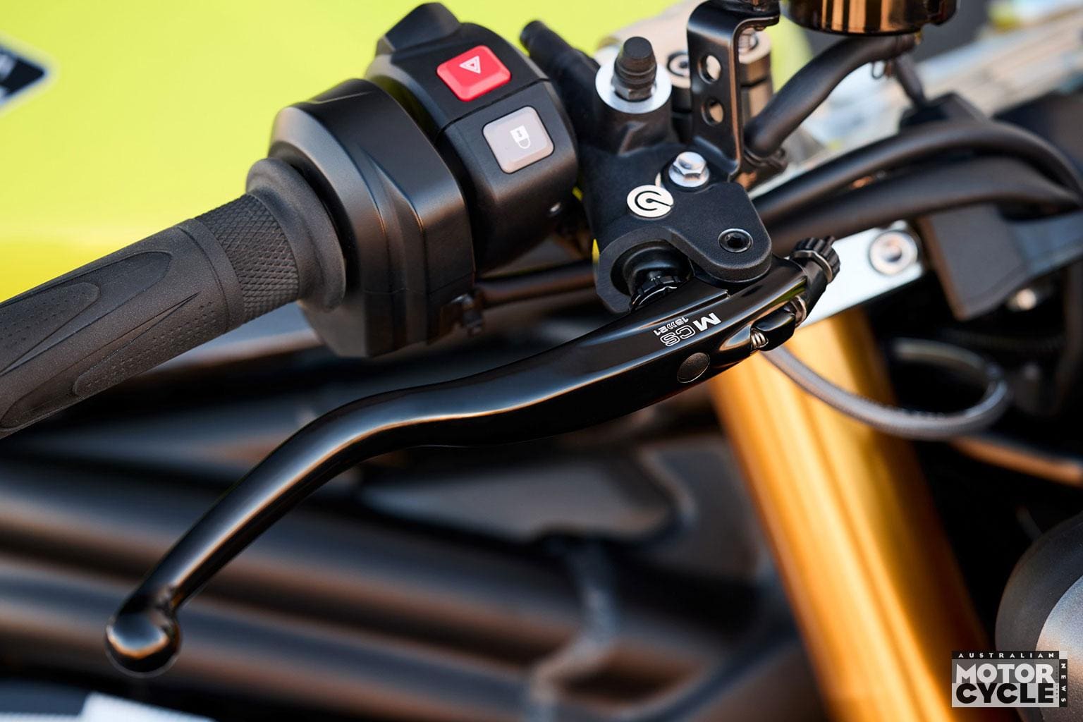 Weighing in at the same 199kg wet as the stock Speed Triple, the straight-line performance isn’t going to be any different, but the revised riding position promises improved handling.