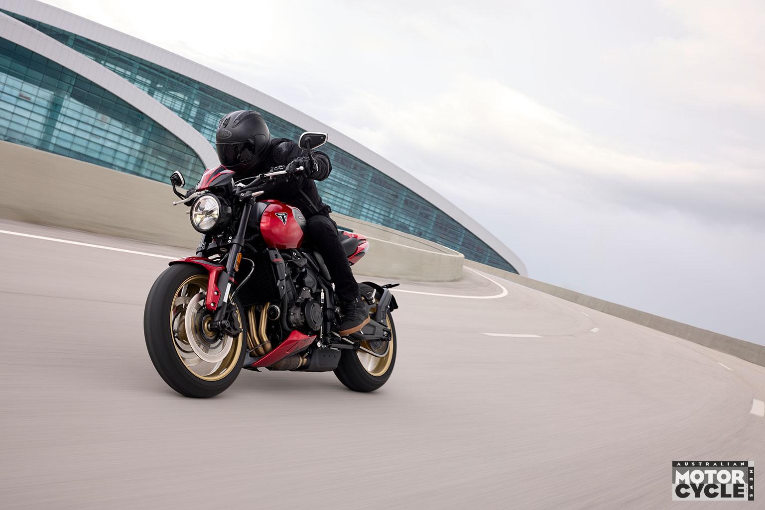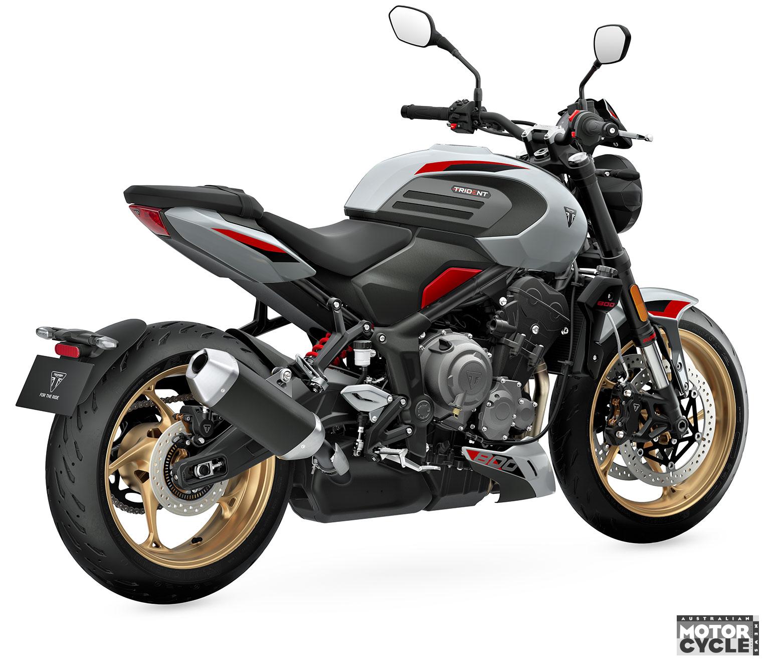 Finish and detailing follow the Trident family template, with a sculpted tank, slim tail and premium surface treatments, plus contrasting gold‑coloured wheels for some extra visual pop. Colour options at launch are Ash Grey/Diablo Red, Carnival Red/Graphite and Jet Black.