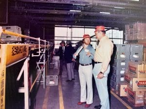 Paul-Spooner-left-deep-in-discussion-with-a-Yamaha-factory-employee-during-the-dealer-trip-to-Japan-in-1975