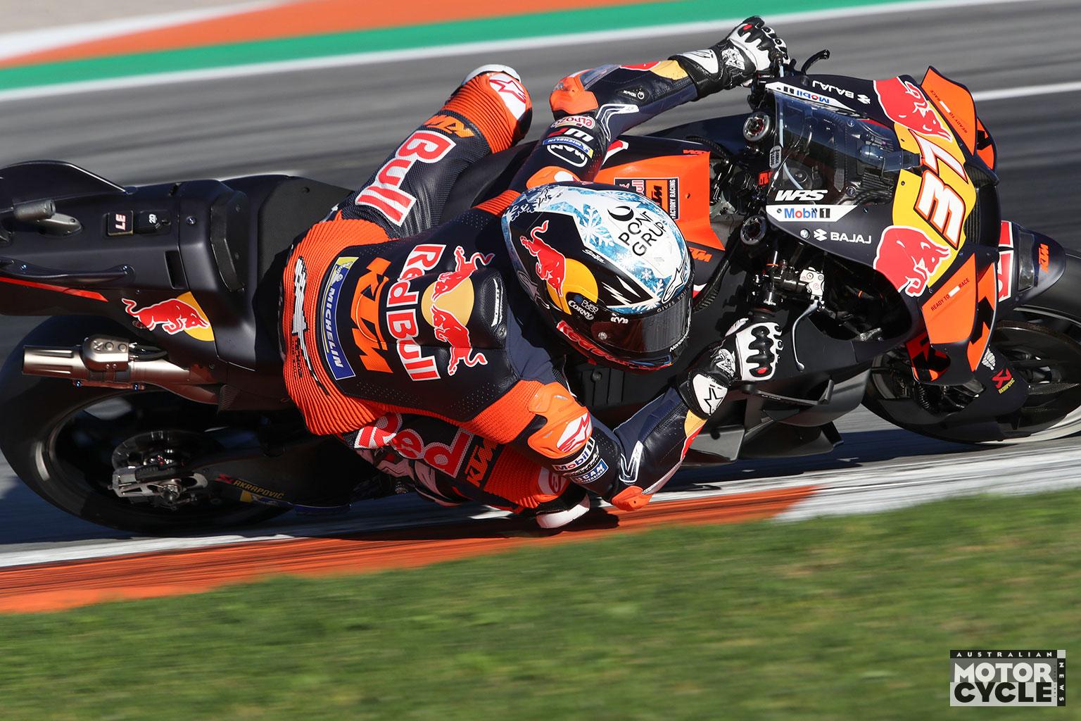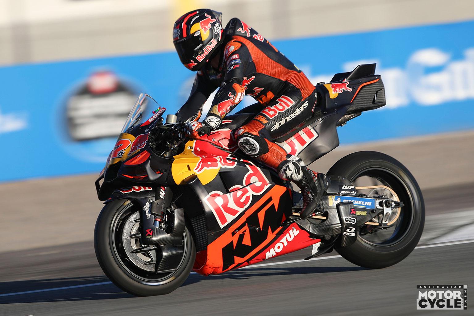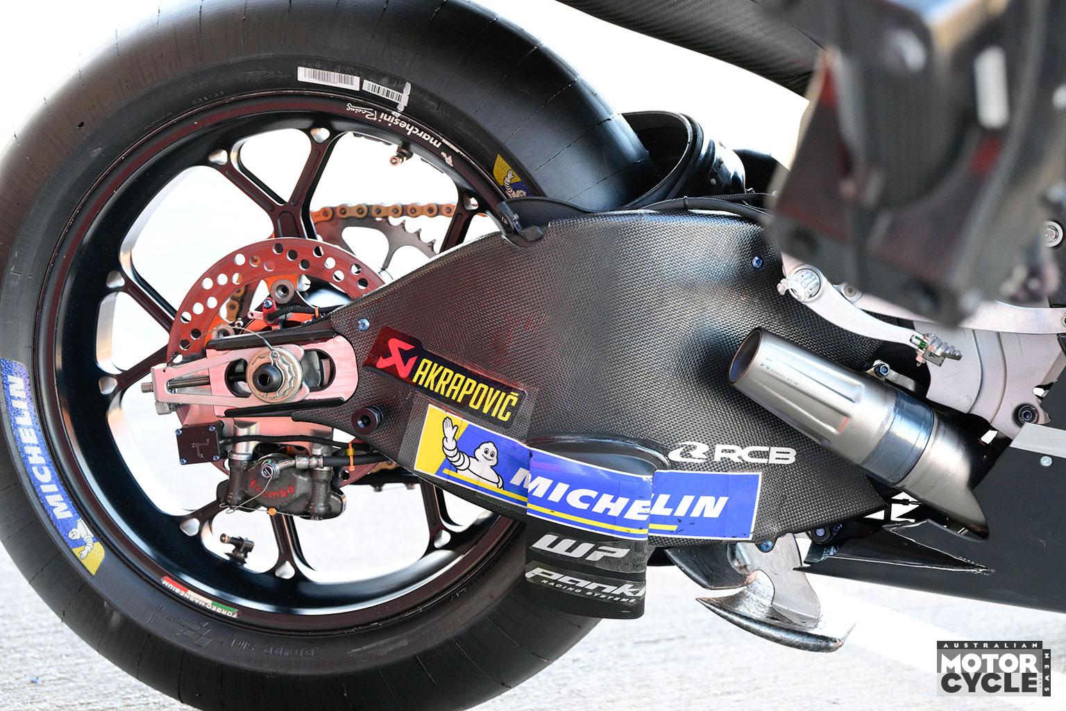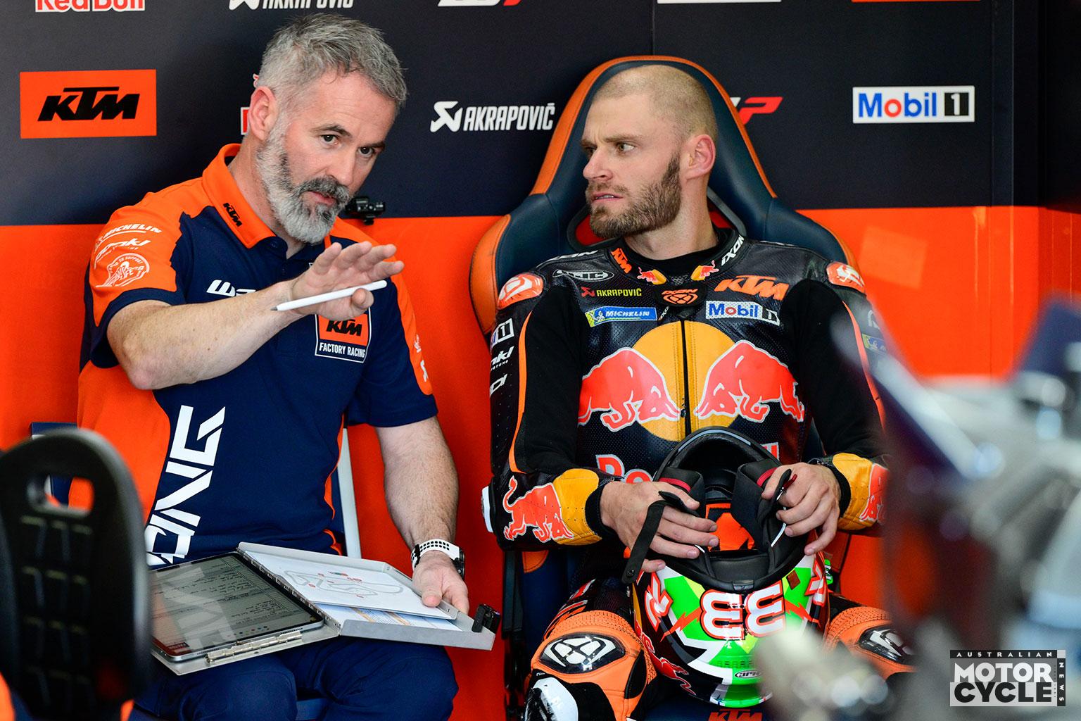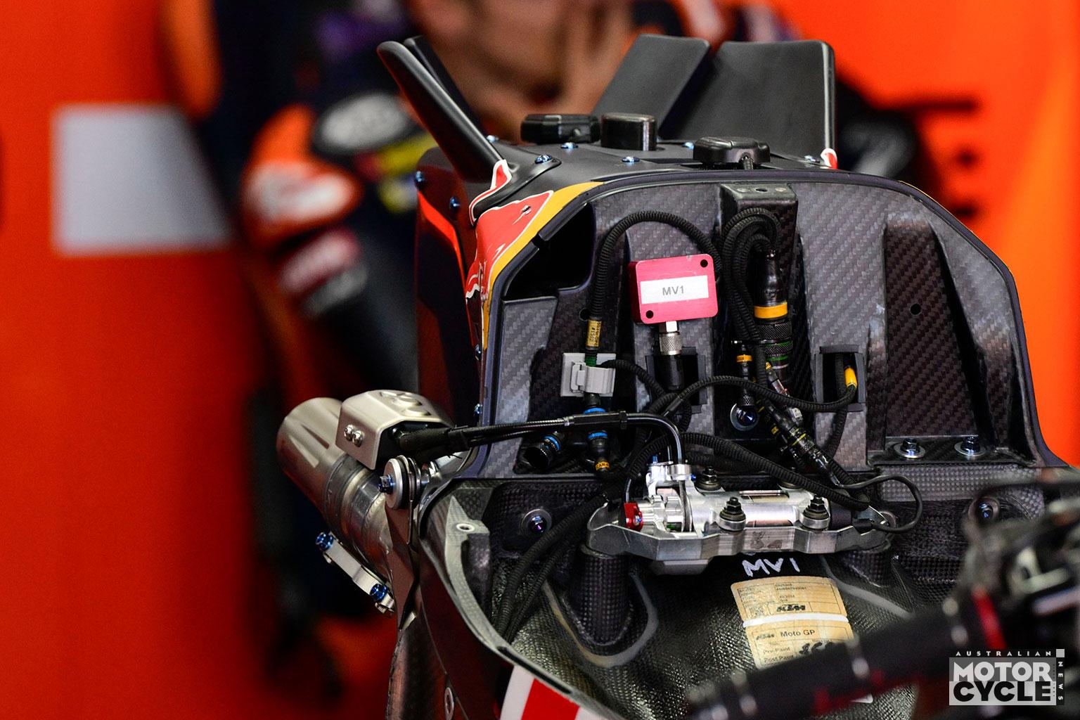 Maverick Vinales and his crew chief found out earlier this year that by moving the rider’s seating position 60 mm rearwards, the bike could be ridden smoother and faster; all KTM riders followed suit. He is now coming back from injuries and here he tried the latest version of the (carbon) chassis and swingarm, the same as Pedro and Brad are already using. These were better he said, but not a huge step. He praised the way KTM had organised this test, claiming it was better organised than last year, when he first jumped on the bike (Barcelona).