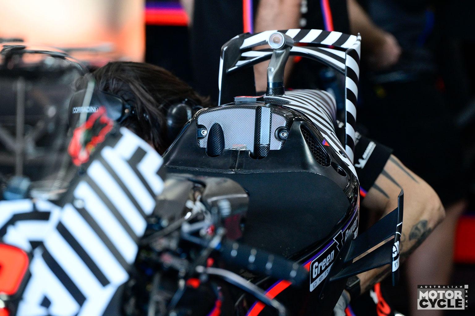 Brad Binder tried aero too and went a bit further, claiming that “some of the aero we tested made me feel more in between the wheels, where some other option helped me in the braking.” But he didn’t try a combo of these but looked forward to doing so in Sepang. Brad also tried a new seat unit. It was smaller between the legs and probably a bit lower too: “It allows me to move a bit more freely over the bike.” The seat unit had a different shape of the tail unit, suggesting that something else is changed too. That could be a new version of a tuned mass damper, or maybe they have moved parts to elsewhere on the bike because they wanted to change the weight balance.