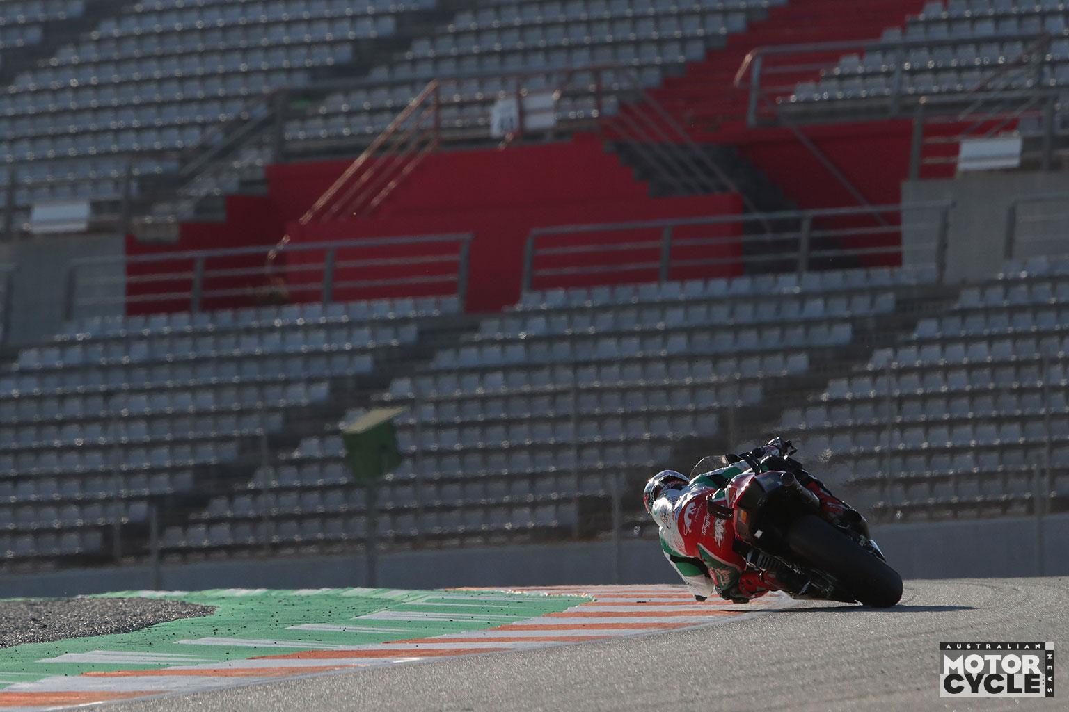 The weakness of the RC16 has been edge grip, understeer through longer corners and tire life. The bike also needs careful initial braking, where the brake pressure has to be built up gently. Hard, aggressive braking makes the bike pitch forwards which means the rear tire can’t be used for stopping effectively.