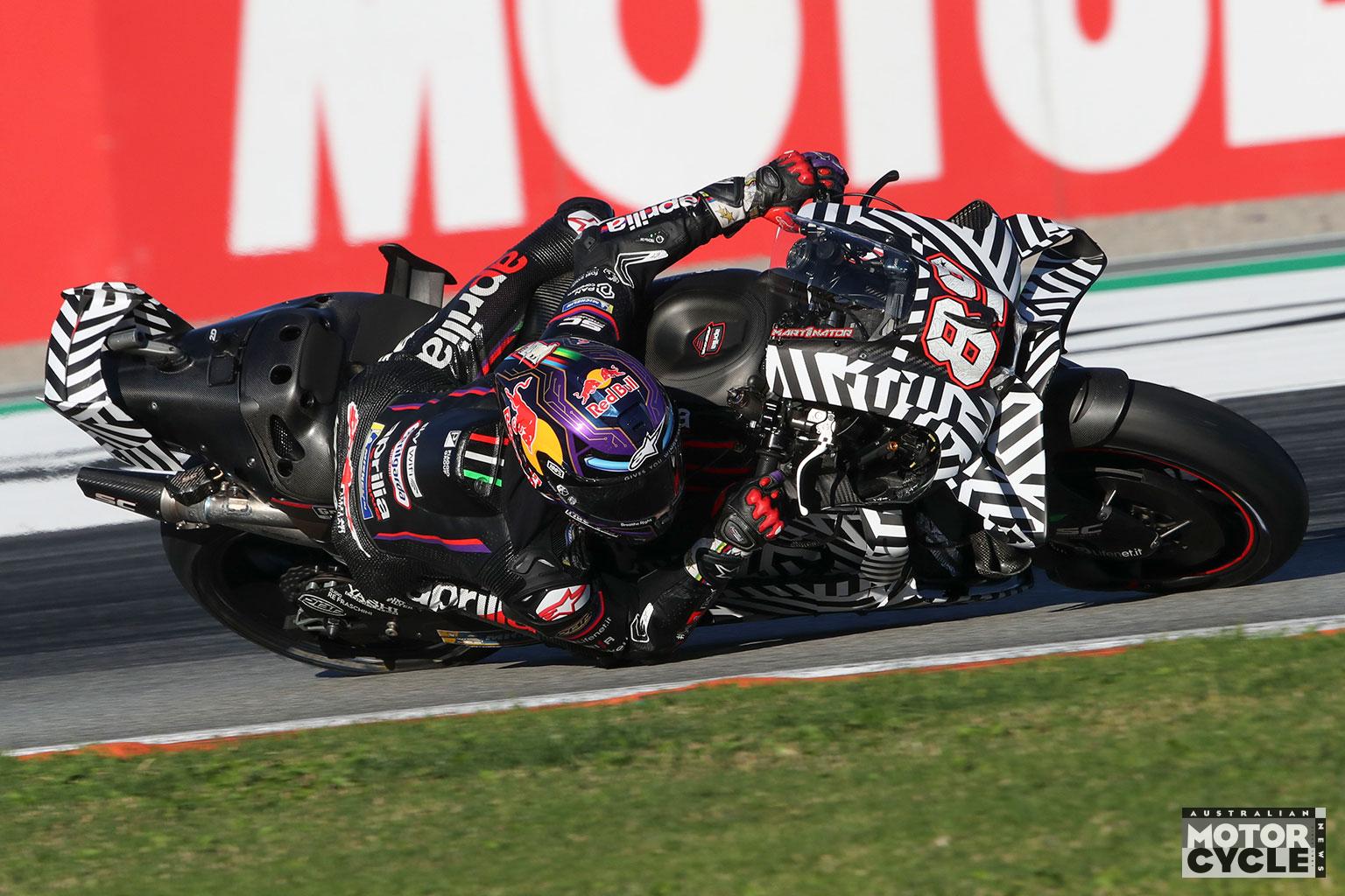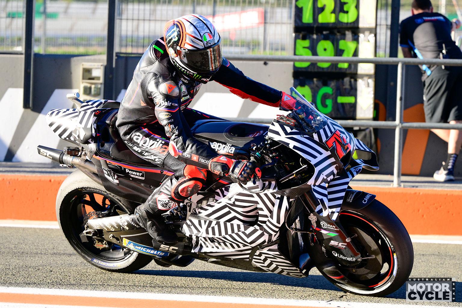 Aprilia has what is considered by many as the best bike on the grid, yet they still brought lots of parts to Valencia. The majority of the testing came down on the shoulders of Marco Bezzecchi. Martin is still in the process of learning how to ride the RS-GP fast without falling off. His physical condition is still not good enough yet; he misses strength and with that, the confidence to push and feel the limit. He started the test on the latest chassis, the one that Bezzecchi was already using at the last rounds, and he immediately liked it. “More natural, better fitting to my riding style.” Being quite small, he still hasn’t found the position on the bike that he needs and so he tested footrest positions and different tank supports. Riders have to be able to withstand the higher forces during braking, because of the aero and devices. But at the same time they need to dangle a leg, modulate the front braking (that keeps locking up) and make quick steering corrections while the bike slides.