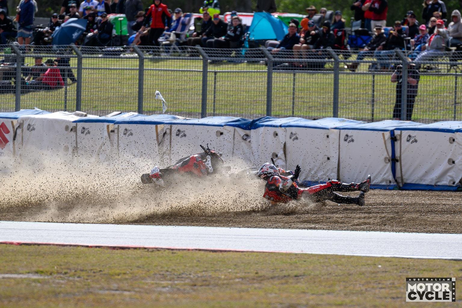 Jones was digging deep in his bid to reel in Waters out front, setting a blistering 1:07.2 – only a smidge off the lap record as he homed in on Waters’ rear tyre. Drama unfolded behind when Voight took Pearson down attempting to repeat the same ambitious move he pulled on Allerton earlier in the race, but this time it ended in tears for both riders. Pearson was clearly unimpressed, having been firmly in the hunt for third place.