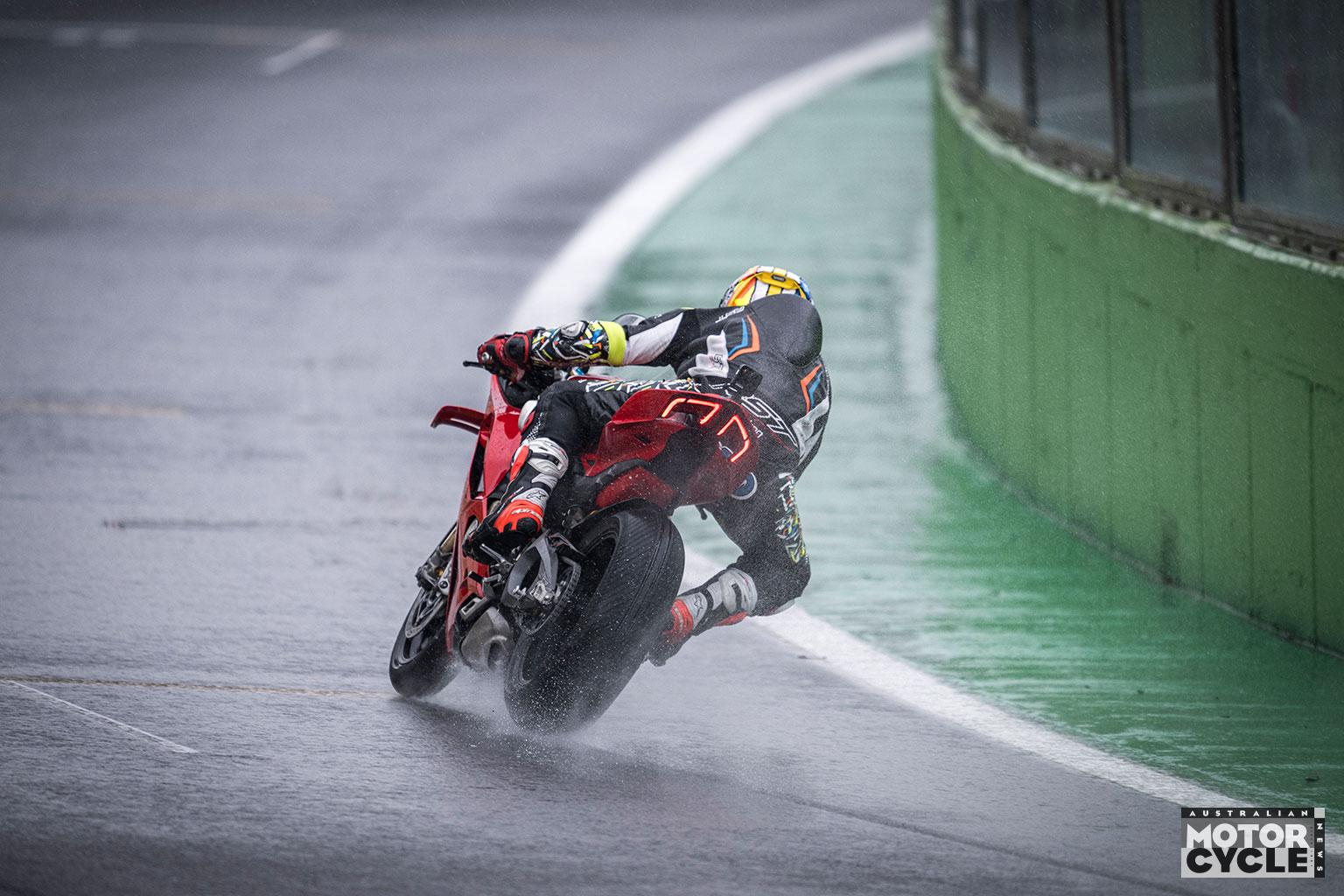 Immediately, rainwater runs from the screen and sculpted bodywork as I take Turn 1 and 2 in fourth gear (normally fifth into sixth in the dry). Into Turn 4, it’s heavy on the ABS-assisted brakes, keeping that precious heat in the front Pirelli, while trying to be smooth. Exiting Turn 5 into 6, it’s hard on the gas and time to be brave.