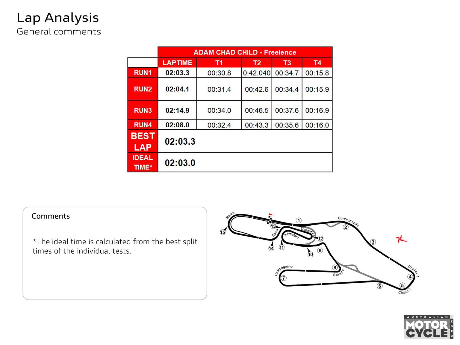 Good data takes no prisoners but can also be extremely illuminating. The traces on Page 2 of my Lap Analysis report show that as I gain in confidence I’m getting faster and faster through turns 1, 2 and 3, the scary-quick Curva Grande. The three lines in the yellow box show my apex speed is higher. As the line rises after the yellow box, you can see I’m carrying more speed around the long Turn 3 before breaking for Turn 4 at close to 240km/h.