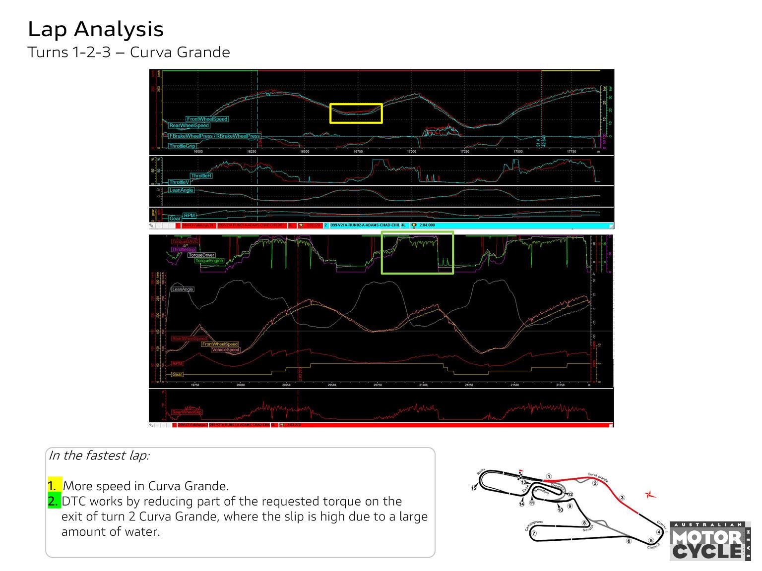 The throttle grip (purple line) goes from fully open to closed, and the brakes are applied. I’m only braking with the front brake. In the highlighted green and yellow boxes, the top blue line is the amount of brake pressure I’m applying, while the actual brake pressure being applied by the cornering ABS is the green line underneath – this prevents the front from locking. The white line is rear brake pressure – remember, I’m only applying the front brake, the system is doing this automatically. ABS is also working on the rear, which is also being applied automatically.