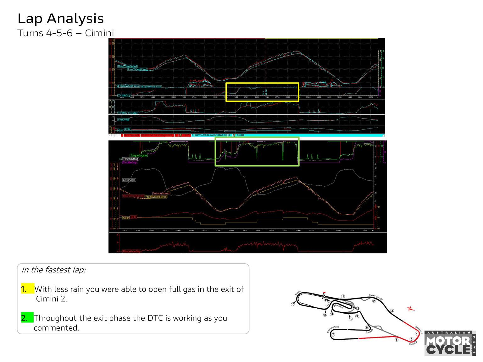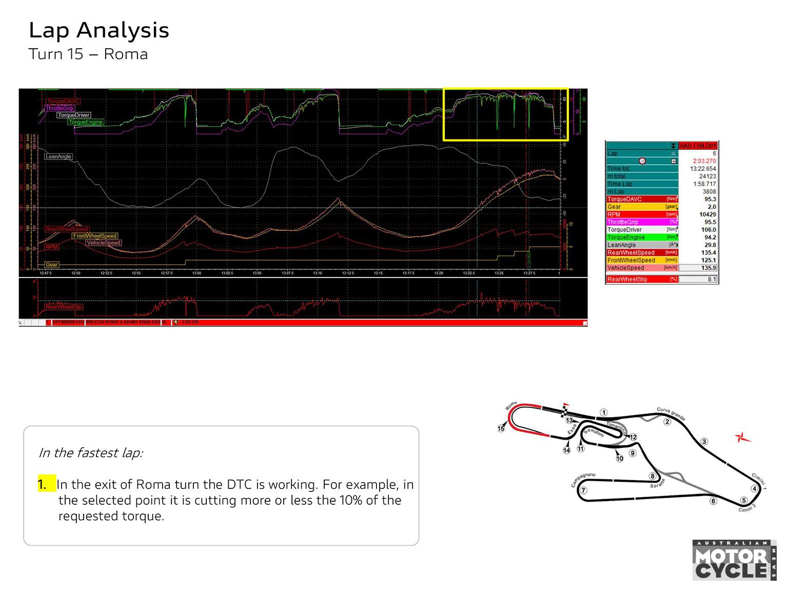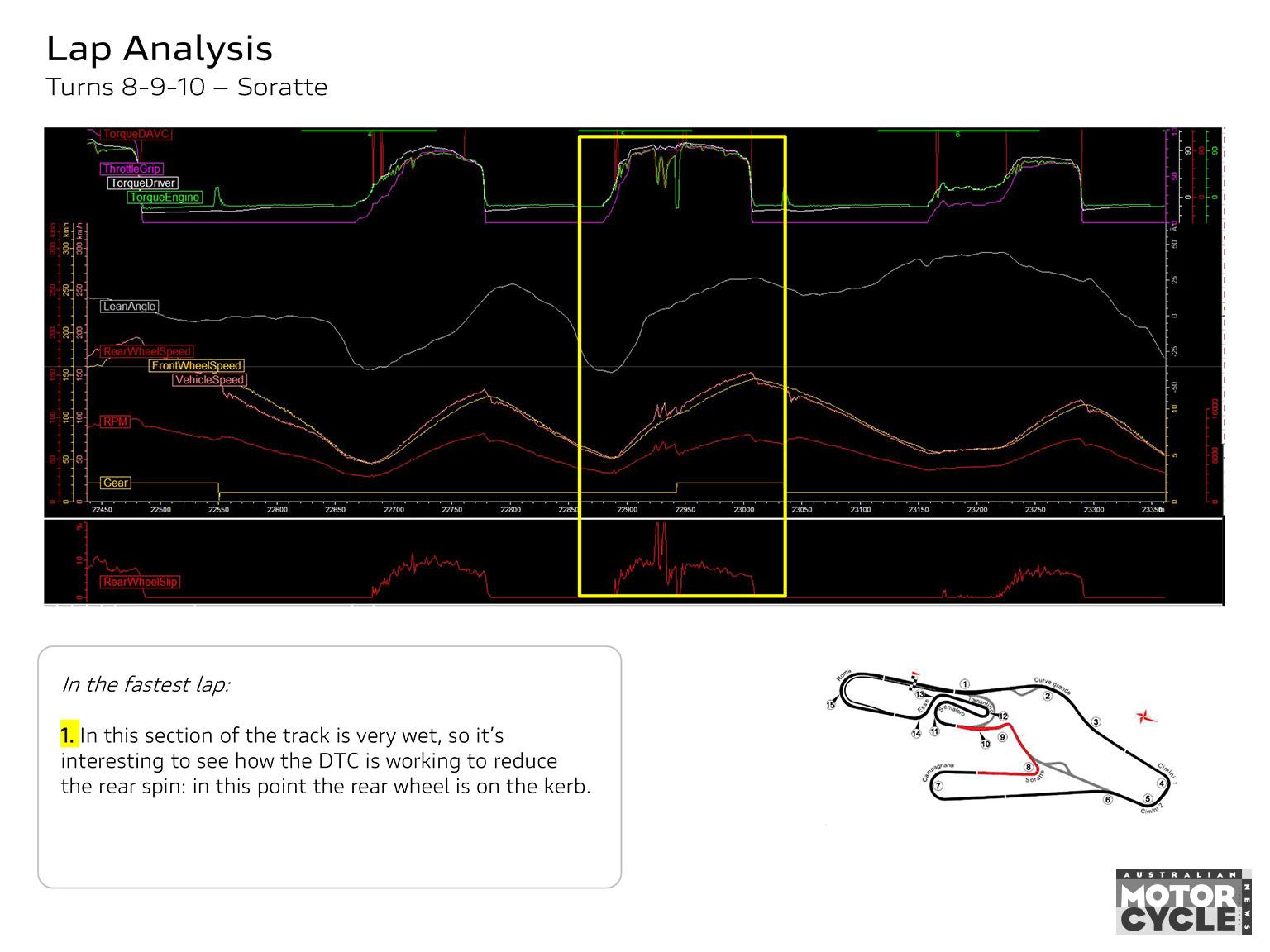 The highlighted yellow box on Page 9 shows the wide opening of the throttle (purple line) with the actual torque going to the rear wheel much lower (green line). The V4 S is in second gear, the engine is at 10,429rpm, the throttle position is 95.5 per cent open and the chassis is at 29.8 degrees of lean.