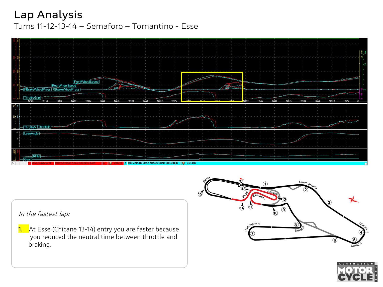 The final section of track from Turn 8 is tight and technical, the opposite of the rapid first section. In this section you still rely heavily on the rider aids, but also chassis feel, with kneesliders desperately seeking the Italian racetrack.