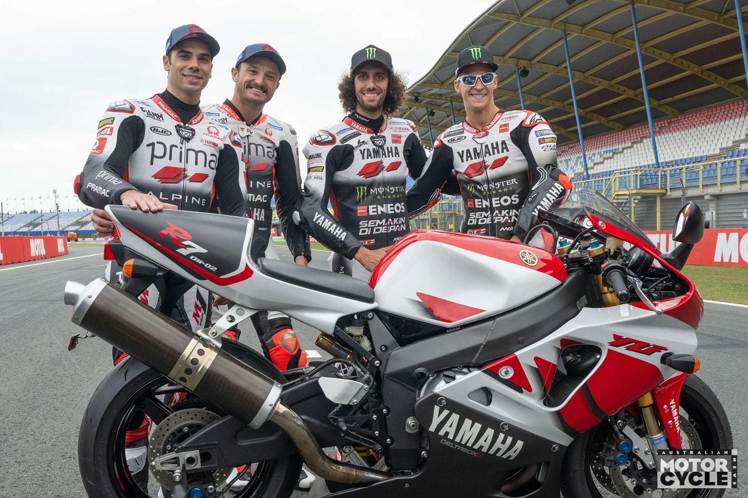The Monster Energy Yamaha MotoGP Team and the Prima Pramac Yamaha MotoGP Team will run unified red-and-white colour schemes across their bikes, rider gear, and team outfits on Sunday. The special anniversary design is inspired by the 1999 YZF-R7, a machine that became iconic in the hands of riders like Noriyuki Haga in the World Superbike Championship.