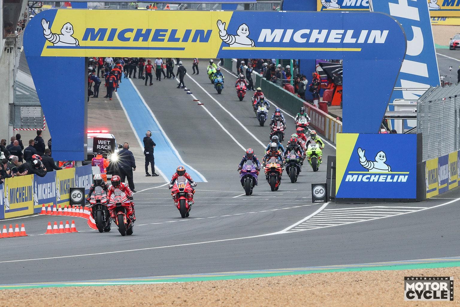 Rain clouds loomed large over Le Mans ahead of the MotoGP French Grand Prix, casting uncertainty over tyre choices and setting the stage for what would become a chaotic, unforgettable race. As riders lined up on the grid, light rain began to fall, making the track treacherously slippery. The prospect of worsening conditions forced teams into last-second decisions, and the confusion only grew as heavier rain crept in. On the warm up lap every rider came back into the pits to swap bikes before the lights went out, resulting in an aborted start. On the restart, however, many riders flooded the pits again to change back to slicks, incurring double long lap penalties in the process. Only a few – including Jack Miller, stayed out on wet weather tyres.