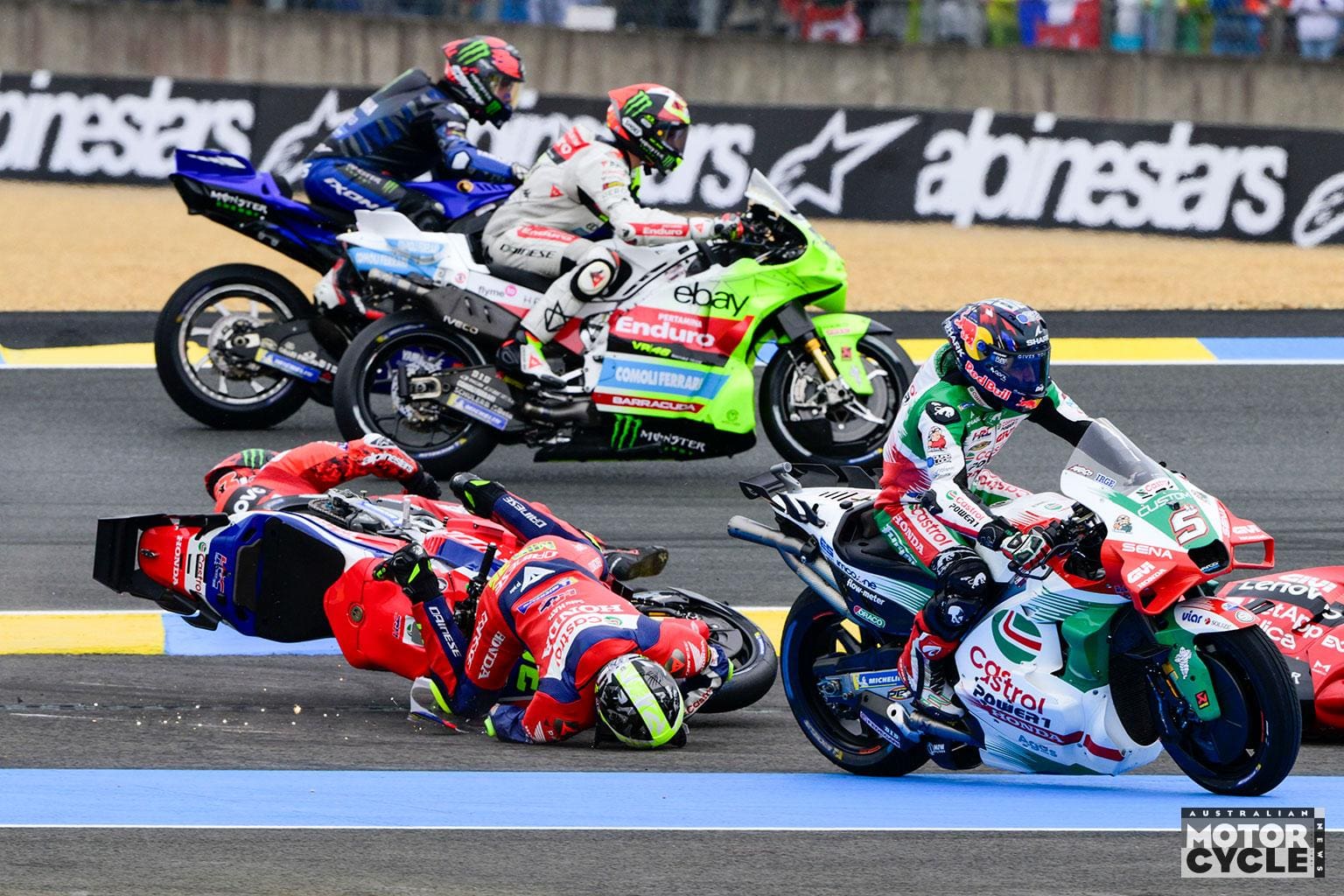 From the moment the lights went out, the drama was relentless. Marc Marquez got the holeshot while Pecco Bagnaia disastrously slid out at Turn 2. Fabio Quartararo, rallying in front of his home crowd, took the lead at Turn 5, only to relinquish it after serving his first double long lap penalty. He rejoined in fifth, but then crashed at the final corner along with Brad Binder.